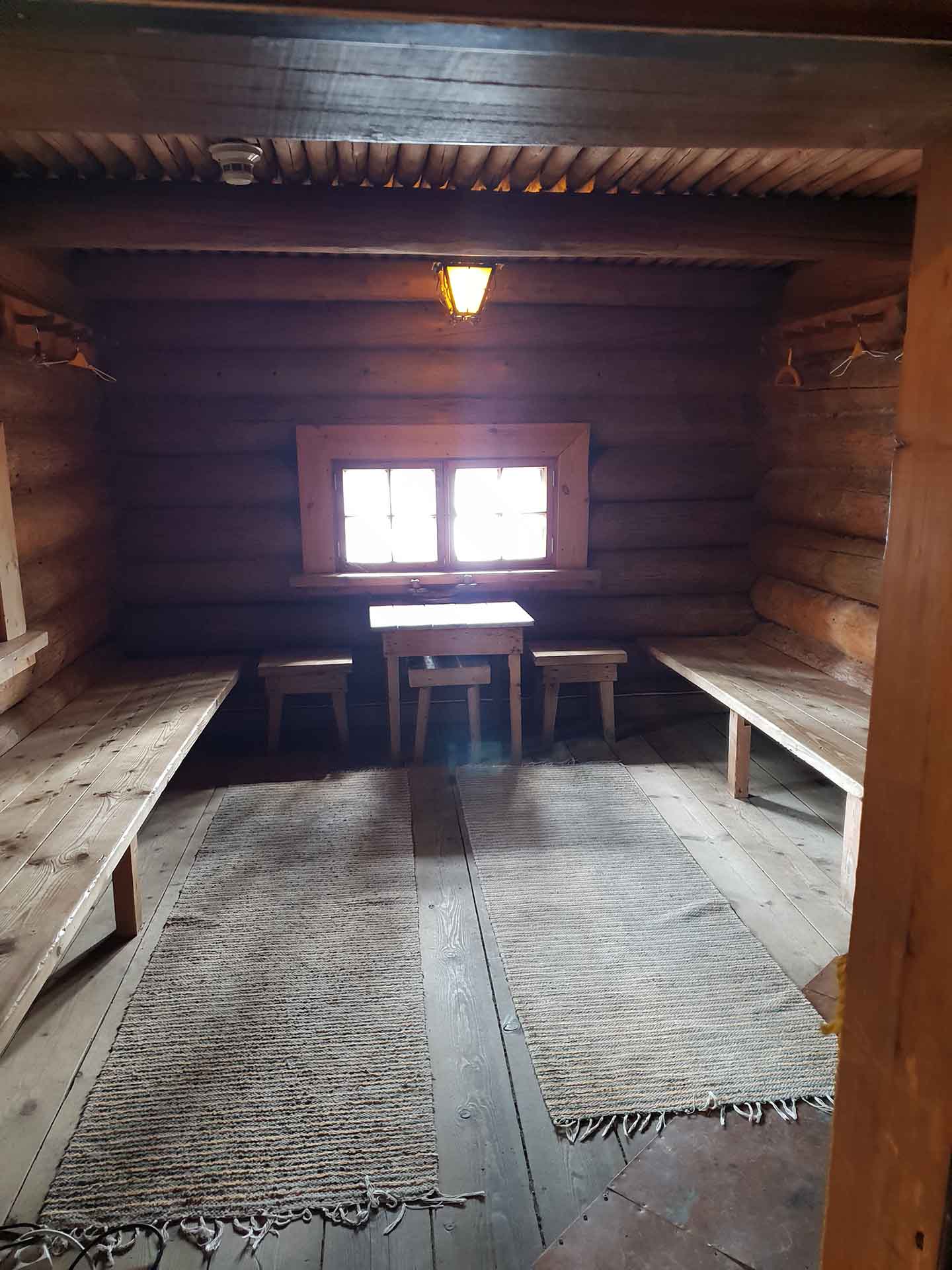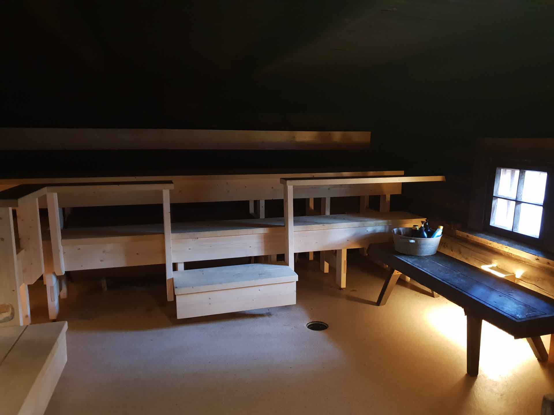 Saunan lauteilla noin 15 löylyttelijää kerralla nauttii Marskin hengessä leppoisista löylyistä , mutta isompikin joukko saunoo siellä mukavasti.